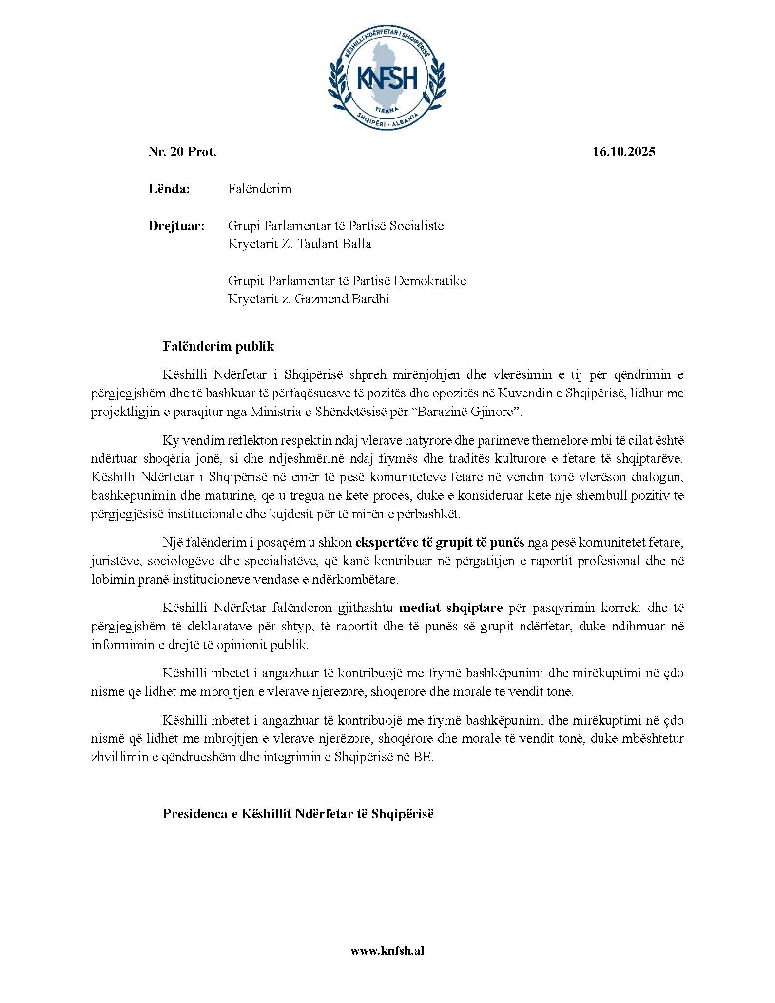 Tiranë, 16 tetor 2025 – Këshilli Ndërfetar i Shqipërisë ka shprehur mirënjohjen e tij për qëndrimin e bashkuar dhe të përgjegjshëm të Grupi Parlamentar të Partisë Socialiste dhe Partisë Demokratike lidhur me projektligjin e paraqitur nga Ministria e Shëndetësisë për “Barazinë Gjinore”.